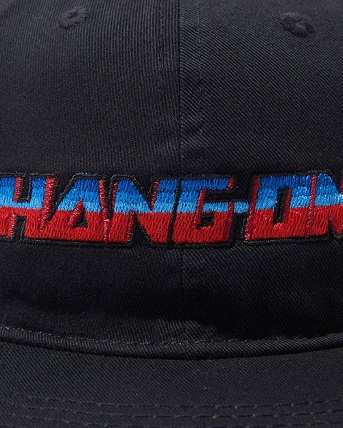 フロントにヘングオンのグラデーションロゴ刺繍したツイルキャップ。ベルトサイズ調整が可能。